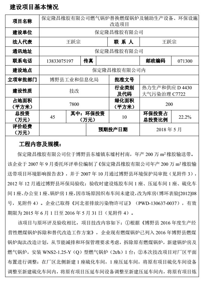 保定隆昌橡胶有限公司燃气锅炉替换燃煤锅炉及辅助生产设备、环保设施改造项目环境影响报告表