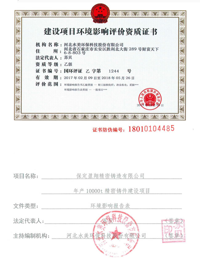 上一篇: 保定盈翔精密铸造有限公司年产10000T精密铸件建设项目环境影响报告表